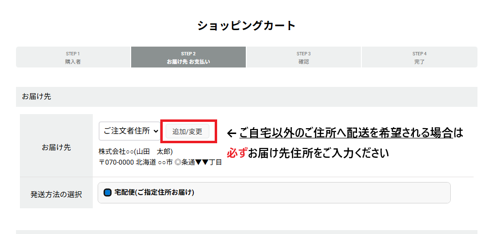 ②STEP 2 の「お届け先」 にある「追加/変更」でお届け先ご住所をご入力ください。
